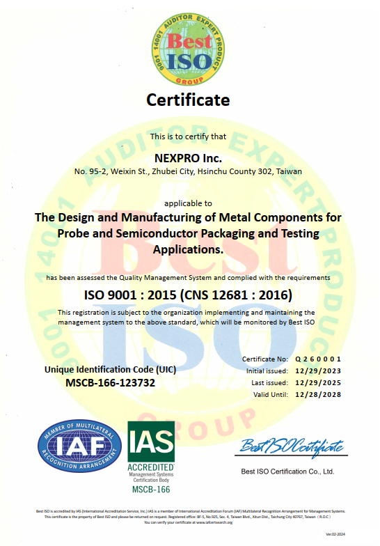 NEXPRO Inc. completed the renewal of its ISO 9001 Quality Management System certification on December 29, 2025. The company will continue to strengthen quality management and process optimization to provide customers with stable, high-quality products and services.